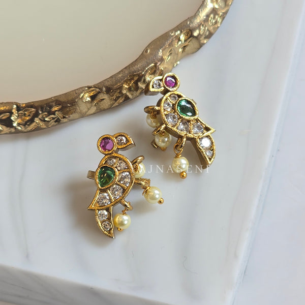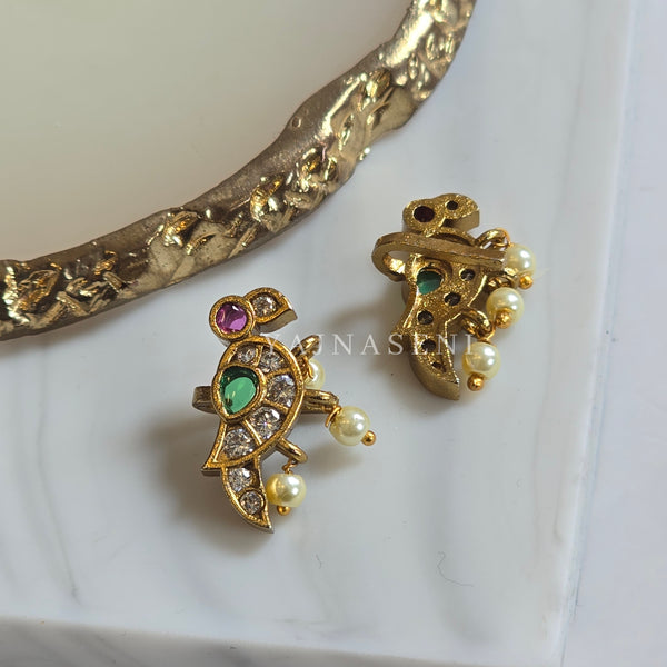A bugadi helix clip-on is a non-pierced version of the traditional bugadi, designed to hug the upper ear cartilage securely with a clip mechanism ; giving the same ornate, ethnic look without needing a helix piercing.