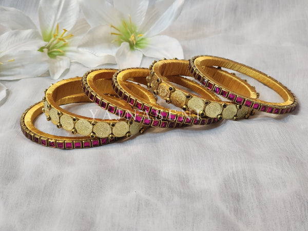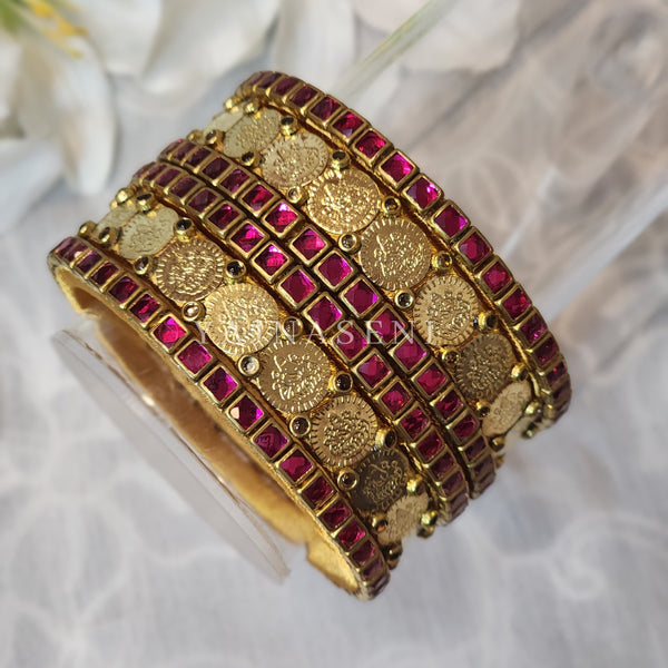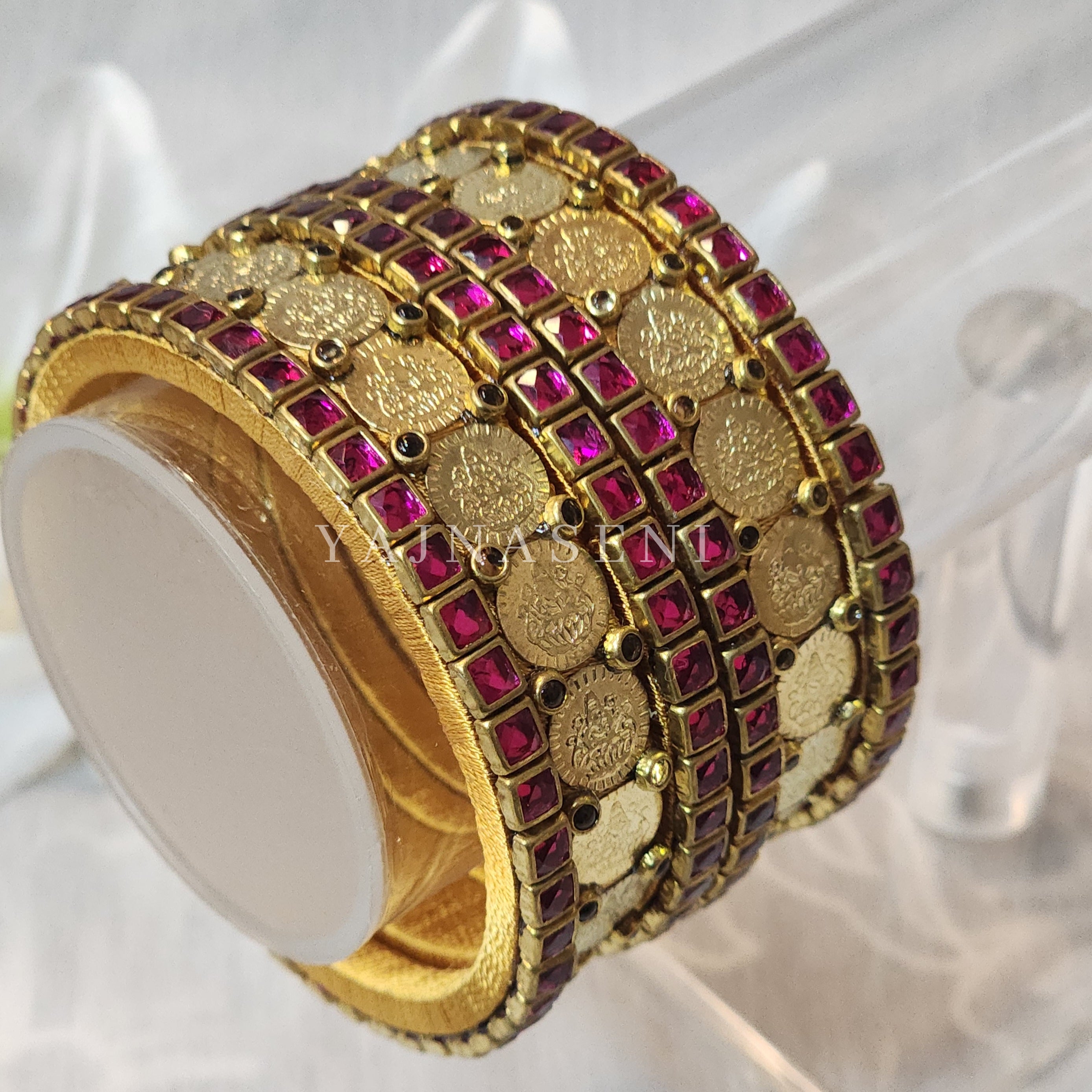 Quantity: 1 set as seen in the images = 6 bangles (4 kundan + 2 coin)