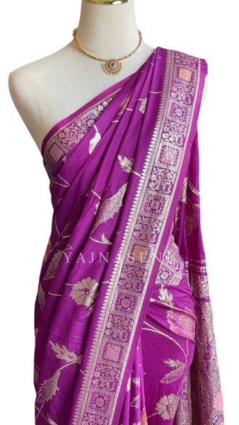 Semi silk saree with a stately woven pallu adorned with botanical patterns. Its structured texture highlights the intricate motifs while maintaining a graceful, elegant silhouette.