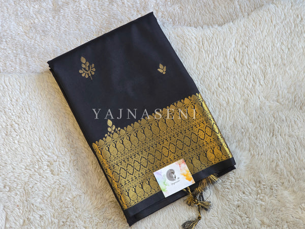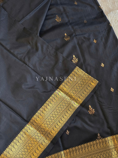 Little and dainty motifs in a shimmering light gold zari! This saree exudes traditional charm with a refined touch of glamour. Perfect for attending weddings, festive gatherings, and occasions where you want to make a graceful statement.