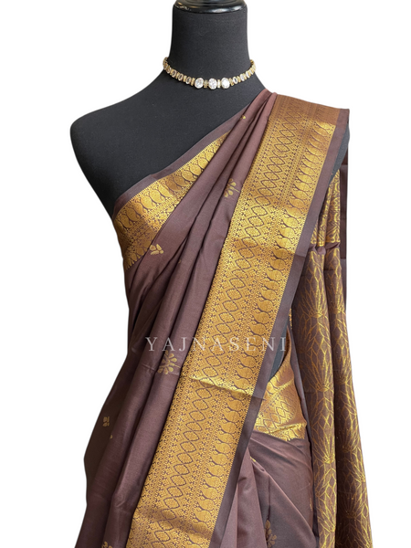 Little and dainty motifs in a shimmering light gold zari! This saree exudes traditional charm with a refined touch of glamour. Perfect for attending weddings, festive gatherings, and occasions where you want to make a graceful statement.