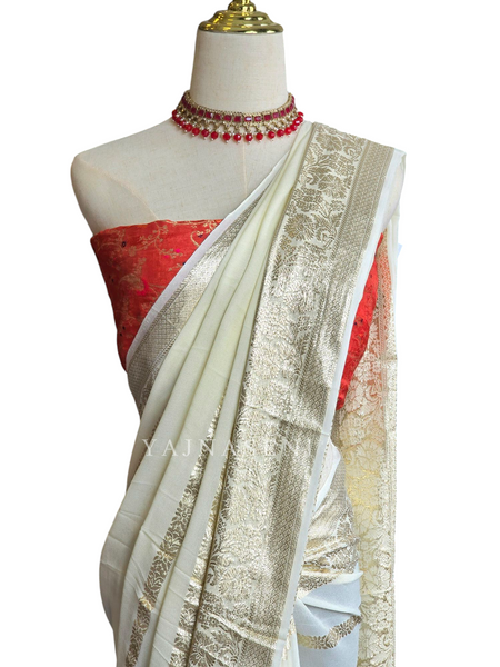 Viscose Georgette Saree x Light Gold Stripes : Cream